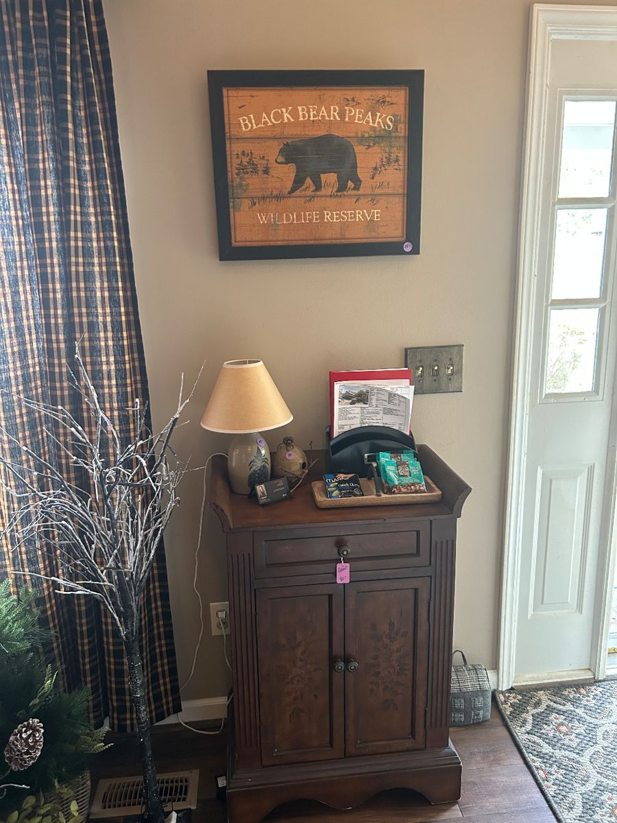 PARTIAL LIST OF ITEMS: House Full Of Wildlife Décor; Large Collection Of Williamsburg Figurines, Byer’s Choice Ltd; Christmas Decorations; Rocker Recliner; Odd Cabinets; Wood Log Cabin; Buffet; Wildlife Trail Dinnerware; Rustic Retreat Plates & Cups; Farmer’s Market Sign; Side Table; Red Cabinet with Tin; Lowe Pottery; Log Cabins; Pottery; Lantern Lamps; Moose and Bear Figurines; Wooden Barn; Daniel Boone Whiskey Jug; Lantern Hill Pottery; The Jefferson Monticello Lamp and several other lamp; Wood Barrell Grinding Lamp; TV Stand; JVC Flatscreen TV; Grandfather Clock; Several Footstools; Horse Lamp; Zim’s Heirloom Collectibles; Leather Loveseat; Buckeye Pottery; Trundle Bed; Bookcase; Corner Cabinet; Floor...
