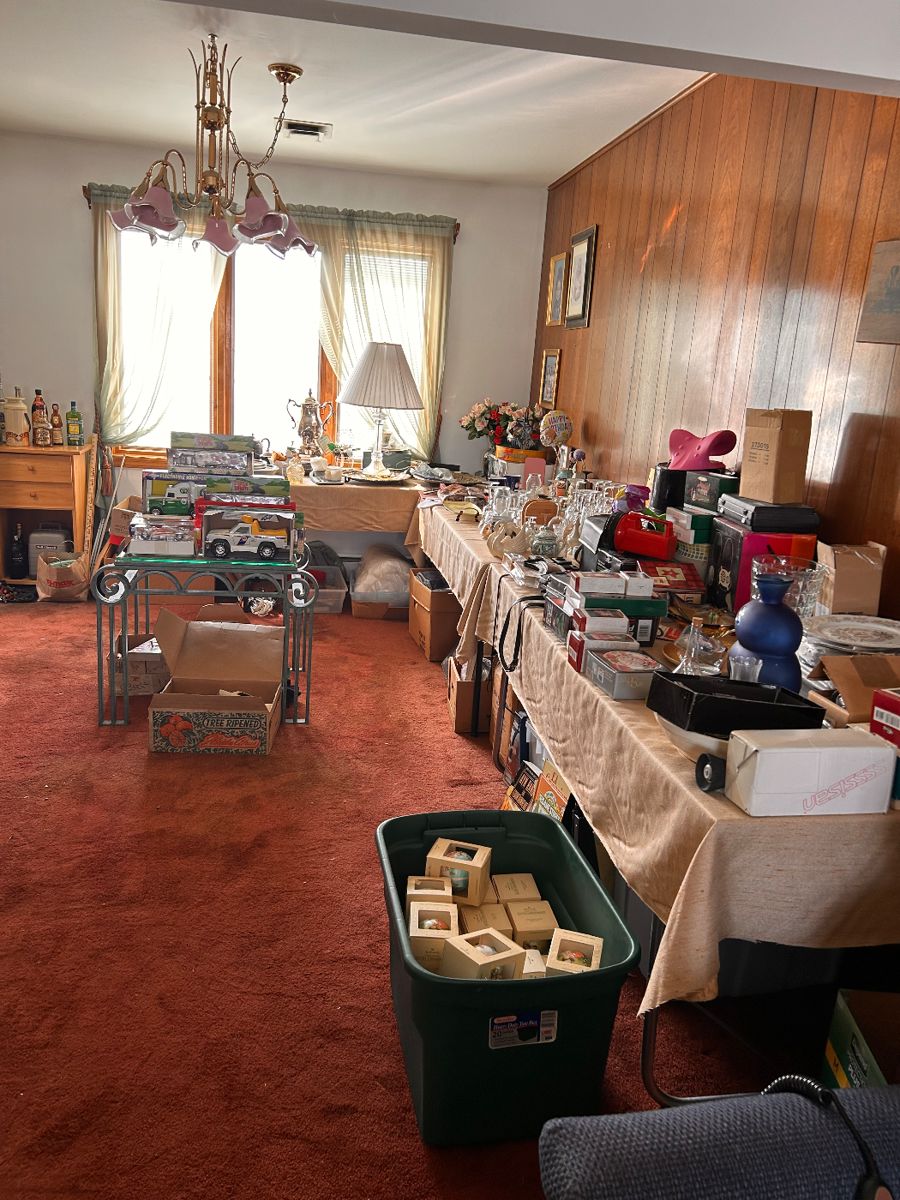 Brady bunch kinda house !!Glassware,furniture,clothing,large collection of Hess trucks,curtains,bedding, precious moments, Christmas, cameras, pool table, model cars, vintage video games, slot, cars, jewelry, tablecloths, kitchenware, tools, sewing machines, lawn furniture,handmade vintage bar,and so much more