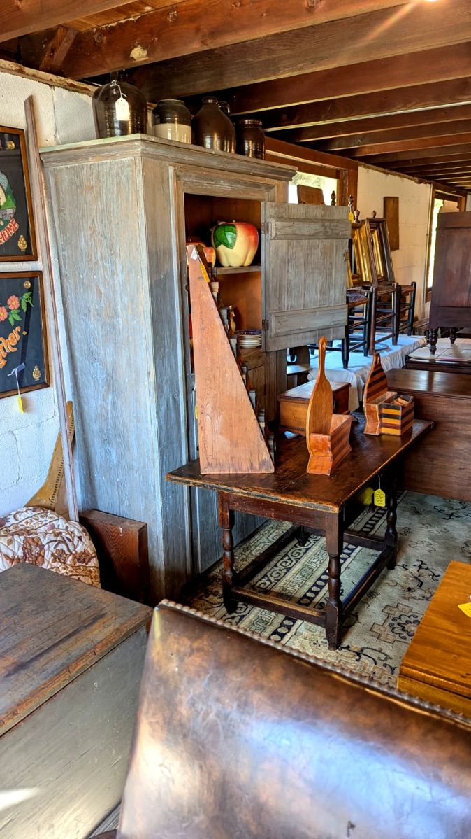 Fifty year's accumulation of fabulous 18th, 19th, and 20th century antiques and collectibles including dining room chairs, rocking chairs, occasional chairs, stools, tables including drop leaf tables, a sawbuck table, side tables, corner cupboards, desks, shelving, pottery and ceramics, salt glaze crocks, mirrors, baskets, benches including a mammy bench, footstools, wall art, trunks, cradles, metalware, an 1830's ballot box, glassware, trays, boxes, an herb drying rack, and much more!!