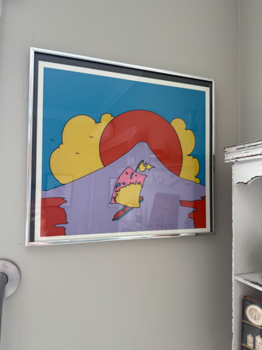WE are back for this fabulous 3 day sale Peter Max "Floating in Peace" Signed Peter Max marked '72 number 233/300! Inside measures 16" x 18"., 1970's Charles Eames for Herman Miller Chair and ottoman, Oak Chair and rocker, Leather Sectional, Antique Humphreys Specifics Oak Store Display Cabinet, Huge lot os MAcKenzie Childs Pottery, Teak Table and 8 chairs, Teak bench, Carved "Welcome Pole" signed Doug La Fortune artist from British Columbia Canada, Lots of art work ( will post more info on Oct 8th), Picasso, lots of clothes, shoes (some Prada) hats and bags, Counter stools, Double Oak Barrister...