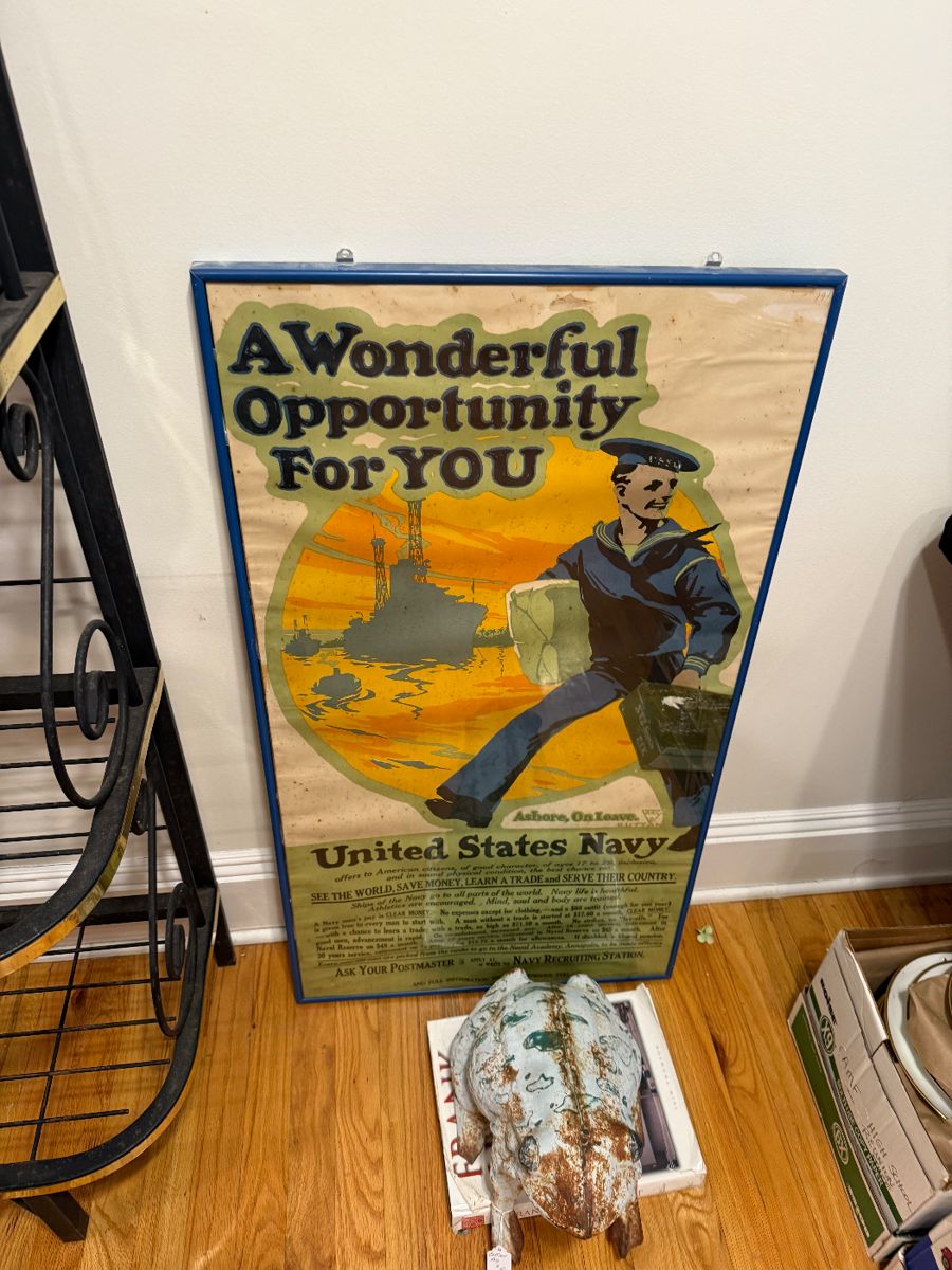 By appointment artwork including original oil paintings and watercolors large Limoges China set Waterford glasses Waterford special collection bowl light up display case antique tables jenny Lind style beds and tables mid century expandable table lamps Al barker original watercolor dressers antique wicker table faux wicker contemporary outdoor chairs Old navy poster world war 1 ? Appears to be original check the pictures . appointments required currently booking estate sales and clean outs for 2026 . Please give us a call !