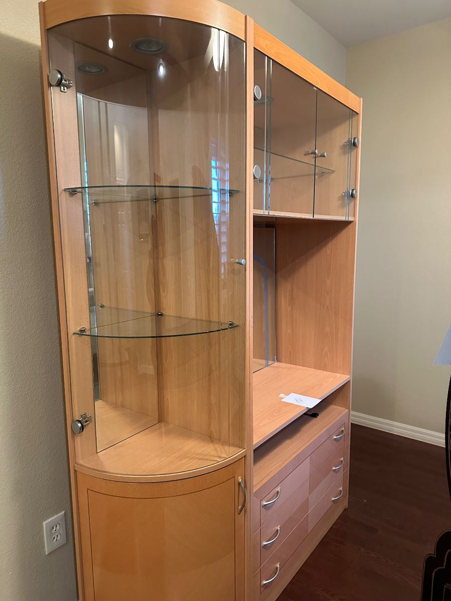 Beautiful furniture. Chinese room divider,/screen. Mid-century modern display case/hutch. Dvds. Working HP printer. Leather arm chair. Desk and chair.  Interesting clocks. Hand-held vacuum and mini-shop vac. Brand-new, never worn Mens size 12 Florsheim shoes. Yard Art. Maurice Legendra art. wooden bench/foot locker. Dining room table. File boxes with colored folders. Arthur Delaney personally signed art.