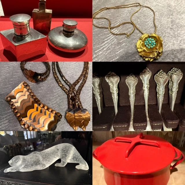 , Charles Jourdain, Donna Karan, Searle, Gucci, Bags, Danny Allesandro fire place set, and Accessories, Designer, Christofle, Tiffany, Coalport, Limoges, Baccarat, Daum, Hoya, Lalique, Annie glass, Kevin O'Brien Scarves, Georgina von Etzdorf scarves, Fine Jewelry, Costume Jewelry, native American JewelryKim Seybert, Barney's, Rosenthal Crystal wine Glasses, Dansk/Kobenstyl cookware, Ralph Lauren, Lalique figurines, Perrier flutes and bucket, all clad, cuisinart, John Hardy Brushes, Reed and Barton sterling silver, Silverplate set service for 12, and salton warmers, Baskets, ice buckets, Allessi clock, southwest pottery, paperweights, perfume bottles and More