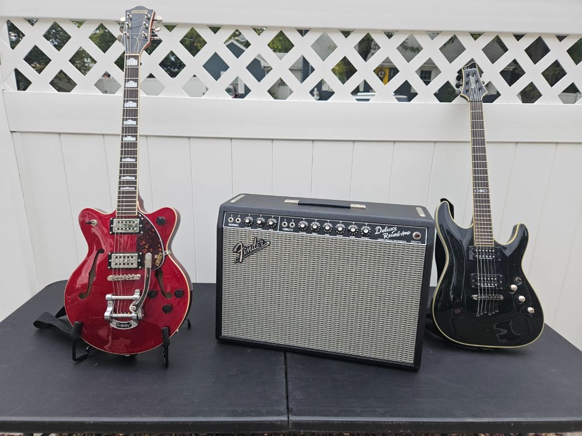 2 Giutars, Fender Amp, glass, china , crystal, brass items, slot machine. US and German Military , pocket books, Sterling Silver Jewelry, Jewelry, Comic, Press steel toys and a lot more