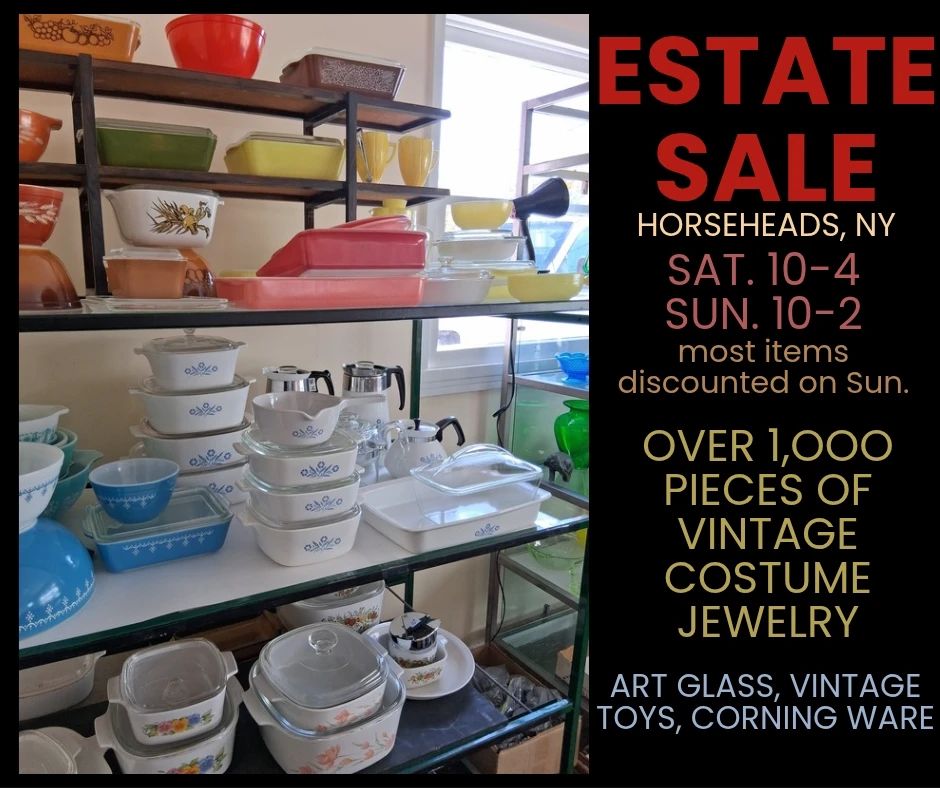 This estate sale features large collections of antique and vintage costume jewelry (over 1,000 pieces), decorative glass, Corning ware and Pyrex, toys and other vintage collectibles. Jewelry: over a century of styles to choose from, starting at $1.00 and ranging to $250+ for finer pieces. Designs from Coro, Monet and many other classic companies. Art glass and Czech glass beads, angel skin coral, natural stone pendants such as Labradorite, opal, austrian crystal, southwestern silver, and much more. Sets, statement pieces, religious and patriotic jewelry, brooches, pins, men's and women's rings. Necklaces, bracelets, pierced clip on and screw back earrings. There...