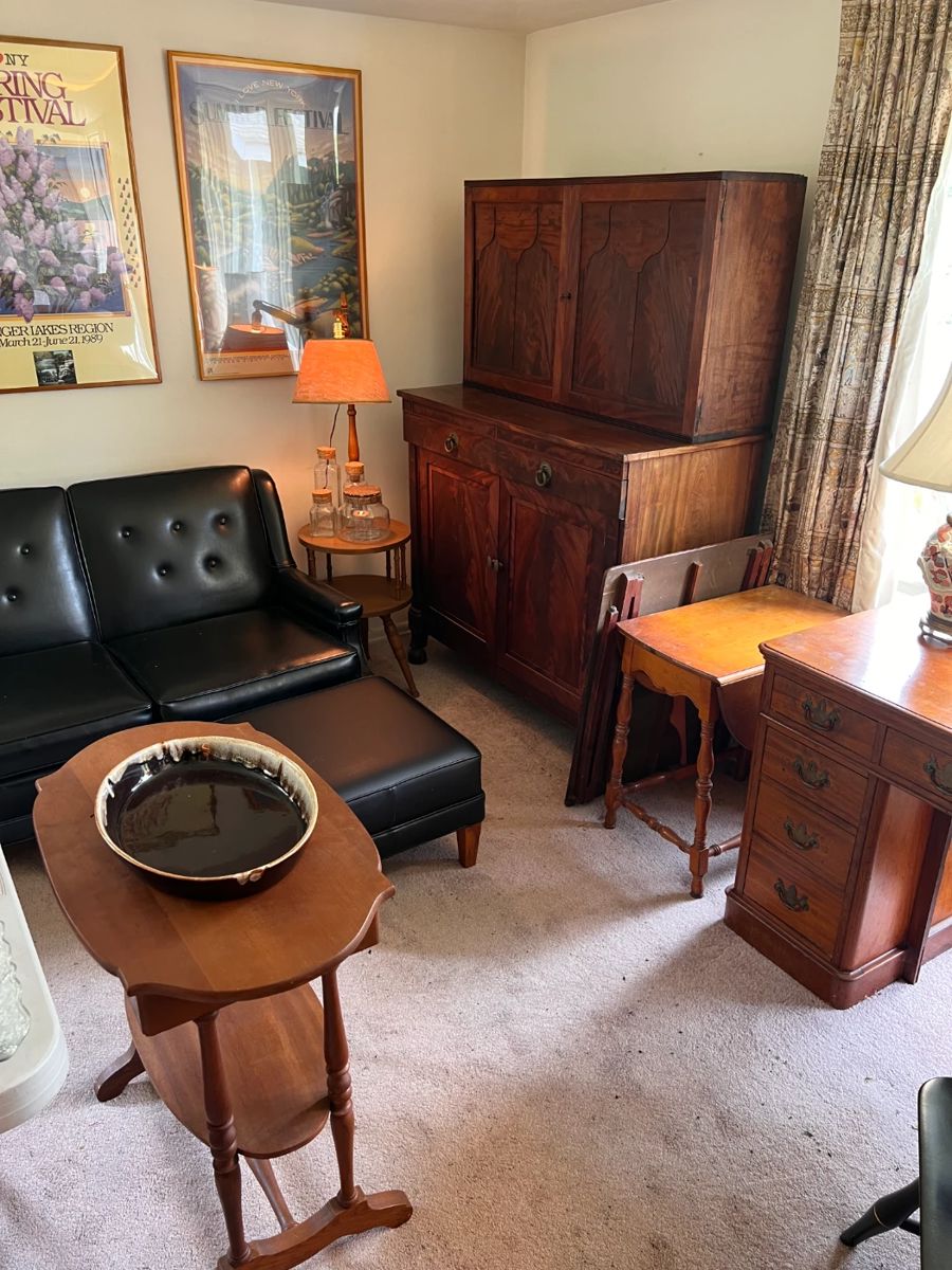 Come explore a 60+ year accumulation of antique and vintage items. This is a full estate liquidation. All items priced to sell, dealers and collectors welcome. Overflowing house and garage. Furniture: 19th c. 18-drawer Apothecary, fancy Empire sideboard and cabinet, set of eight hand-painted Hitchcock style chairs, MCM sofas, Empire chect of drawers, large bookcases, Victorian rockers, 6' round country table, primitive desk, vintage Cornell classroom multi-drawer cabinets, 60's dresser, Vintage maple loveseat and chair, wicker etagere, arched-glass 2-door primitive display cabinet, plus many stands, tables and chairs! Artwork: Susan Titus landscape print, Maxfield Parrish prints, Wallace Nuttings, Dutch landscape...