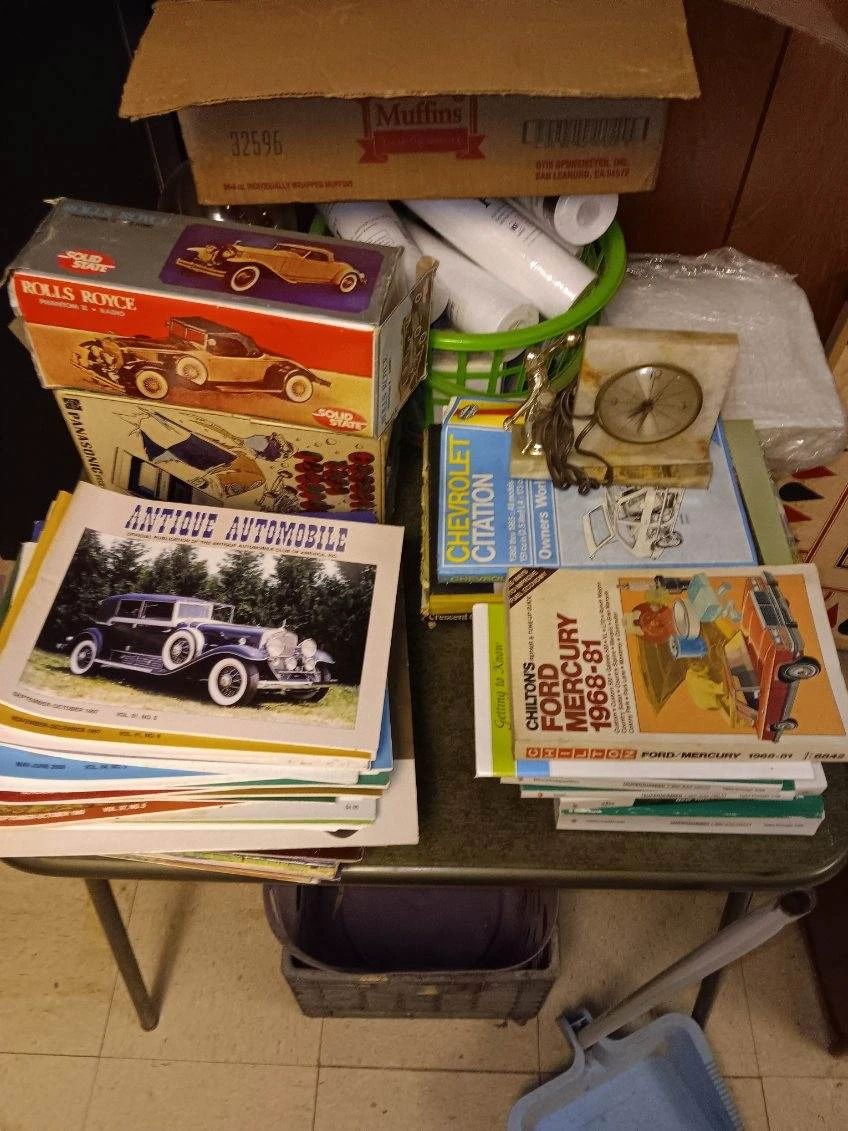 Many garage items, furniture, glassware, kitchen items, model A Ford engine block, new wood garage door, 65 Mustang headlight buckets with header.Variety of oil filters, New 3/4 10 ft M heating pipe etc,etc
