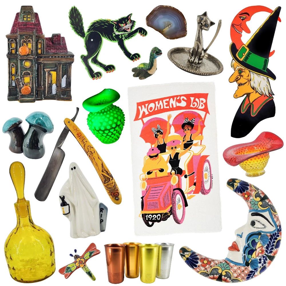 Great Lakes VNTG Kitschy Kooky Witchy Spooky Consignment Avon Lake, OH Our Queen of Kitsch Consignor is back to help us usher in Spooky Season (and beyond) with a glorious assortment of creepy, wacky, kitschy, and classy goodies! With loads of vintage (and some modern) Halloween decor including several Beistle flats, a MINT plastic popcorn witch, and multiple ceramics (including some working lit pieces). For our witchy friends, there are Llewellyn books, tarot cards, a "crystal" ball and pendulum, and the most glorious tie-dyed cloak! And of course, the standard kitsch gems: mushrooms, unicorns, UV reactive art glass, pink flamingos,...