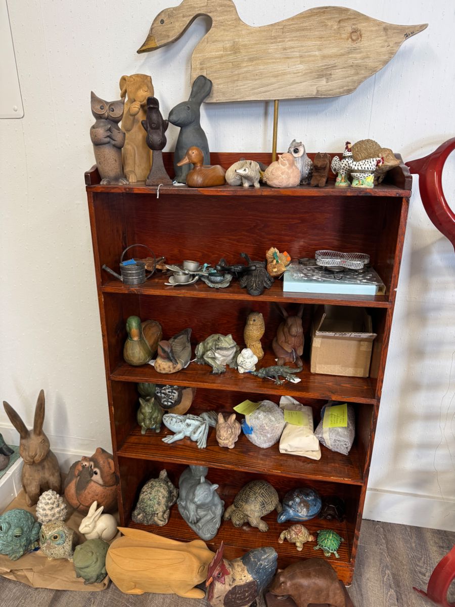 Lots of collectibles, including animal figurines, pitchers, vases, blue & white pottery, crocks, wooden figures, glass figures, ceramics, vintage floral teacups and plate sets, mushrooms, birds, ducks and many other items. Floral and garden supplies including vintage pottery, gorgeous assortment of pots, Asian pots, blue and white Asian porcelain, floral supplies and floral containers, assorted silk flowers for all seasons, garden supplies, floral vases and baskets, pumpkin pots for floral arrangements and tie-dye pots for floral designs. Some furniture including a large kitchen table, set of 4 wicker chairs, desk and desk chair, assorted chairs, corner shelf Assorted artwork including...