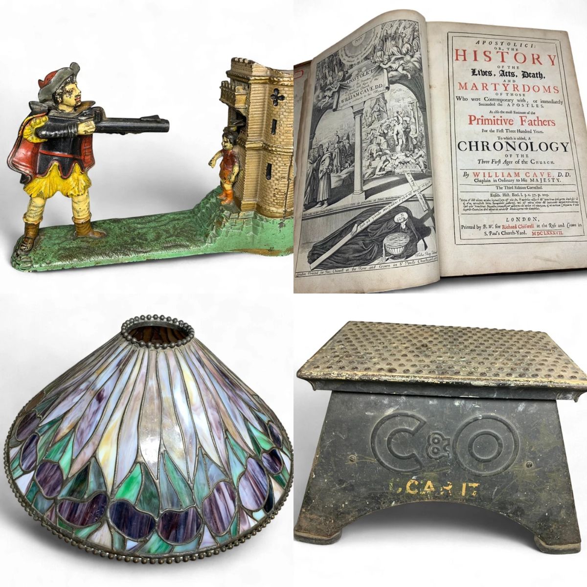 LIVE ONLINE-ONLY AUCTION 1250 Lots of Coin Op, Antiques, Collectibles, Toys, Comics and more! To bid go to www.burnsbid.com!!! Live online only, bidding is open now the live online-only auction begins at 9 AM EST on Oct. 28. There is no in-person bidding. Pickup is Oct. 29 from Noon to 7 pm. We are always seeking consignments of quality items such as guns, coins, jewelry, watches, knives, military, toys, retro, vintage, mid century, rare and unusual and more. Please, no junk! Lot Title 28000 A Pair of Vintage Pulp Paper Mache Halloween Jack-O'-Lanterns 28001 J.E. Stevens 'William Tell' Cast Iron...