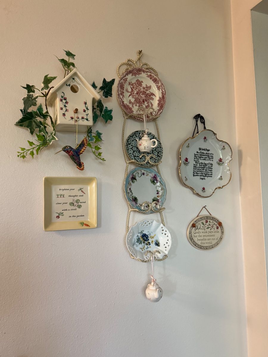DESCRIPTION & DETAILS Furniture Dining tables and chairs, End tables, Dressers and nightstands, Bed frames, Bookshelves and cabinets, Desks and office chairs, TV Console, Small China Hutch, Vintage chairs, Folding tables and chairs, Oak file cabinets, Hammok, Home Decor Table Lamps, Artwork and painting, Mirrors, Vases and figurines, Decorative objects, Ceramic birdhouse with hummingbird, Stained glass, Silk plants, Baskets, Candles, Wall sconces, Plants, Coastal Decor, Collectibles & Antiques Markin train set, China and porcelain, Teacups and pots, Crystal, Cookbooks, Blue & white porcelain and ceramics, Pewter wall hangings, Decorative Spoons, Decorative plates, Polish pottery, Lenox birds, Steins, Hummel plates, Hummel...