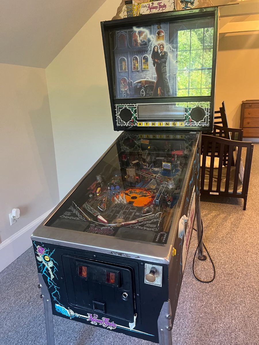 Contents of home including Bally Adam Family Pinballs, Leather Chairs, Children piano, Guitars, Cameras, Turntable, Rattan furniture, Steel desk, medicine bag, audio equipment, Mellinks's Safe/Vault, Stained glass, Vietnamese water bucket, Rugs, Asian Decor, Coca Cola box, Costume jewelry, Rocking chairs, Flower pots, Benches, Meyers snow plow, Counter stools, Spindle back chairs, Ladder, and tools