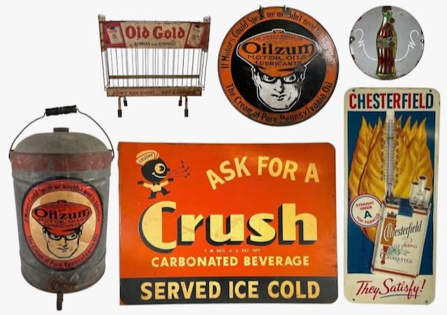 Early Advertising, Primitives and Barn Finds!! This auctions has a lot of long forgotten barn finds to include many copper vessels and pieces, railroad lanterns, vintage license plates, advertising signs to include Crush, Coca-Cola, Pepsi, Oilzum and many unique signs, scales, primitives, primitives, Harley Davidson sissy bar, cast iron and more!! Online Auction 7PM Monday October 28, 2024 Bid Now! www.tomhallauctions.com Preview the auction by appointment, call 610-799-0808 Items are located at Tom Hall Auction Gallery, 4644 Rt. 309, Schnecksville, Pa. 18078 Pick up hours at the gallery following the auction: 12noon-3:30pm the day after the auction Monday thru Friday...
