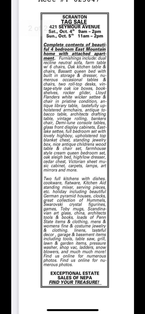 The address for this sale in Scranton, PA 18505 will no longer be shown since it has already ended. Dates