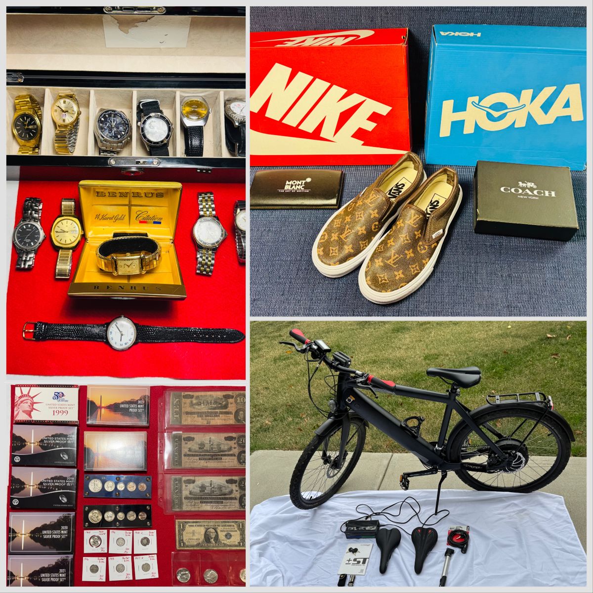 AUCTION CONSISTS OF ITEMS FROM 2 PERSONALLY HELD COLLECTIONS, PRIVATE CONSIGNORS AND MULTIPLE LOTS FROM A PURCHASED ESTATE. LOTS INCLUDE BUT NOT LIMITED TO STROMER ST1 PLATINUM EBIKE KEYDATE US PROOF SETS, MINT SETS SILVER KEY DATE COINS COLLECTIBLE POSTERS AND PRINTS LAZY BOY CUSTOM RECLINERS STAINLESS STEEL 5FT WINE RACKS MECHANICAL AND AUTOMATIC WATCHES STERLING SILVER JEWELRY HEAVY DUTY AIR COMPRESSOR AND ACCESSORIES DESIGNER COACH BAG MID CENTURY MODERN GREEN GLASS & LEATHER SNEAKERS BY NIKE, HOKA, VANS HIGH LINE MOUNTAIN BIKE HELMETS COLLECTIBLE TOBACCIANA VINTAGE SILVERPLATE FLATWARE