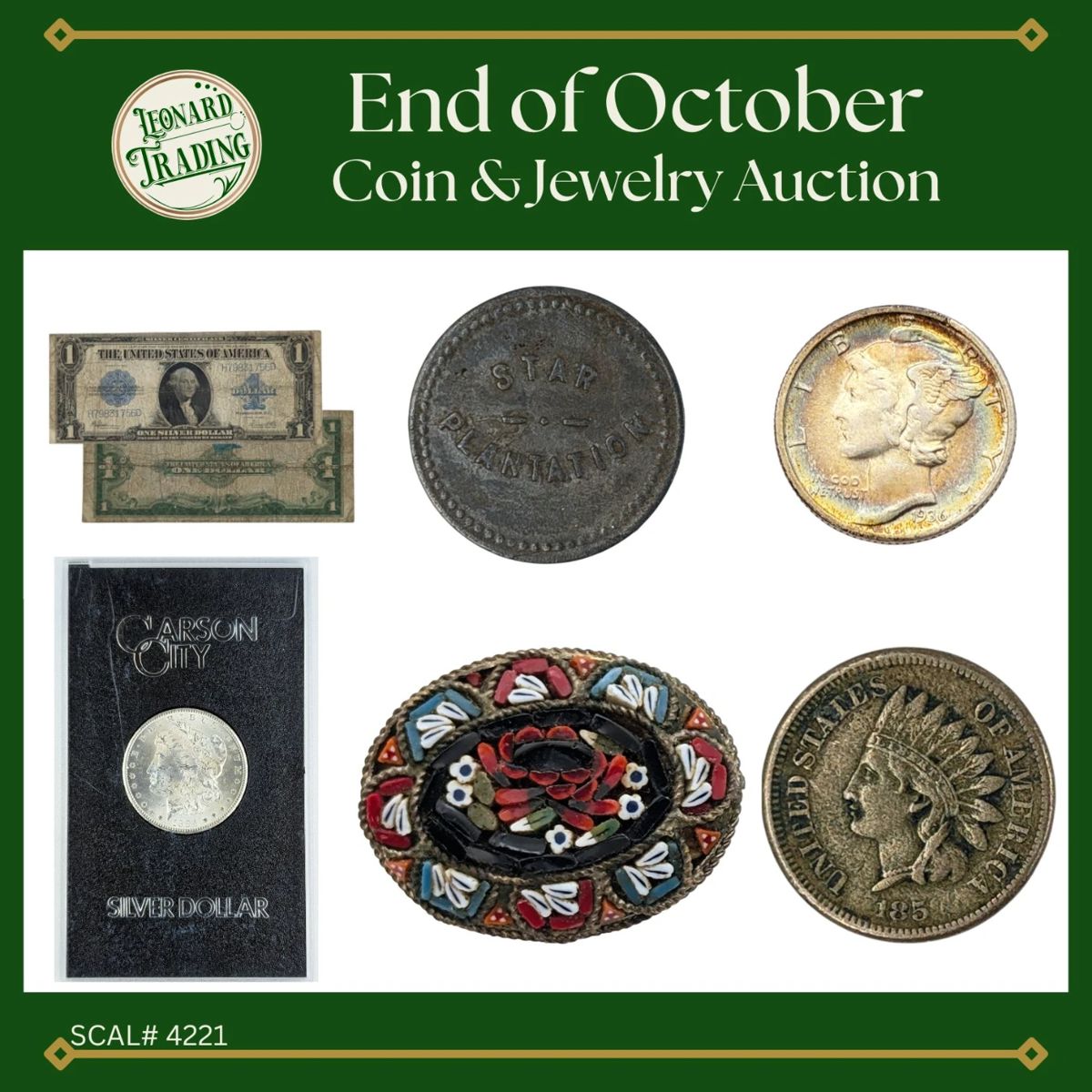 End of October Coin & Jewelry Auction Auction is Live from: 10/28-11/4 Lots start closing at 8:05pm EST on Tuesday, 11/4 Join us for the End of October Coin & Jewelry Auction featuring an impressive selection of coins and a stunning array of fine jewelry pieces. Don't miss this exciting opportunity to acquire rare collectible coins and beautiful jewelry pieces! Pickup is available in Greenville, SC on Wednesday, 11/5 from 3:00pm-5:00pm. Shipping is also available on most items. Bid now to enhance your collection! Featured Items include: 1884-CC Morgan Silver Dollar - Carson City Mint Civil War 1861 Union Volunteer...