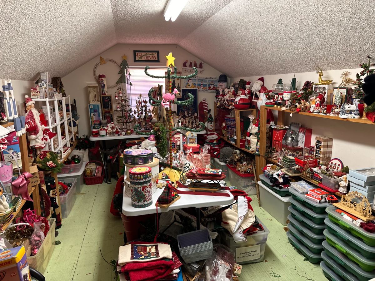 Just in time for the holiday season! Three stories packed full of curated finds from around the globe and multiple craft and gift items for all your holiday needs. This house includes: Vintage German wooden Ornaments German hand blown glass Over 30 Nutcrackers, german and other designs Hand blown ornaments, Fitz and Floyd, Lenox, German and others Beautiful server, china hutch and antique dining table, Primitive furniture including a tall cabinet, displaying over 50 pieces of hand thrown pottery, face jugs, churns, slat tables and ladder back chairs. 25 Quilts of various designs and condition. Iron patio sets, stained glass...