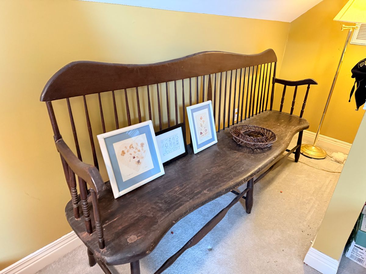 Wonderful lifetime collection of antique furniture and decor. Furniture: marble top dresser, marble top chests, reproduction newer dining table and 6 chairs, white wicker sofa and coffee table, baker's rack, small microwave cart, small tables, antique parlor table, fern stand, leather sofa, entertainment center with bookcase, antique settee, dressers, armoires, cane chairs, file cabinet, full size bed and mattress, queen bed - newer, bedside tables, antique rocker, antique side chairs, sofa table, children's table and chairs, rugs, wrought iron patio furniture, patio table set, chairs, primitive bench Decor : Christmas decor, signed art, antique glassware, lamps, collectible cows, baskets, art...