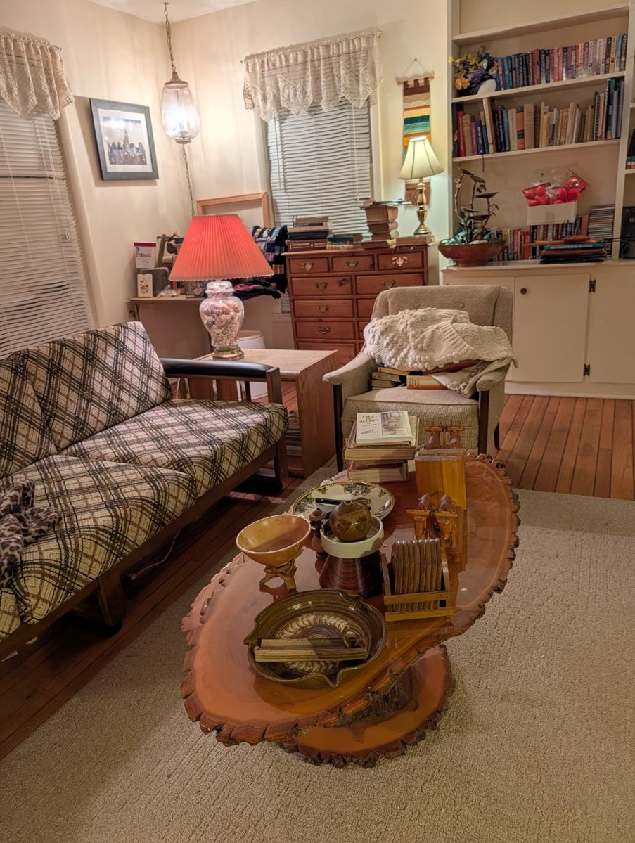 Refrigerator, stove, washer and dryer. pair of twin beds, king size bed, medical equipment, bamboo sunroom sofa, chair and tables, natural slab coffee table, mid century stickley style sofa, sewing machine, white desk and chair, dining table and chairs, 6 board oak chest, brass barley twist lamps, Ethiopian art. Baskets, musical instruments, rolling bar/island with stools, mid century side chairs, animal skin table and ottoman, clothing, kitchenware, tools, Christmas trees and decor, hand crochet and knitted sweaters. Large quantity of crafting and sewing supplies