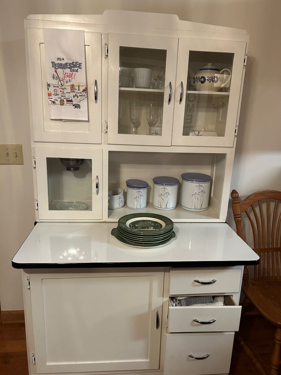Hoosier cabinet in excellent condition, Cash Family pottery, depression glassware, crystal, pots & pans, several dish sets, linens including multiple bedspreads and pillows, sectional couch, end tables, 2 lift chairs, 2 bedroom suites, 2 mattresses & box springs, mirrors, lamps, rugs, curtains, 2 flat screen TV's, TV stand, DVD player, DVD's and cassette tapes, pictures, mounted deer heads and antlers, 2 Christmas trees, (one flocked), lots of holiday decor, antique tables, chairs and cabinets, huge assortment of Christmas village pieces, childs picnic table with benches ( would make an excellent Christmas gift as it looks new) patio furniture, tools, Dewalt...