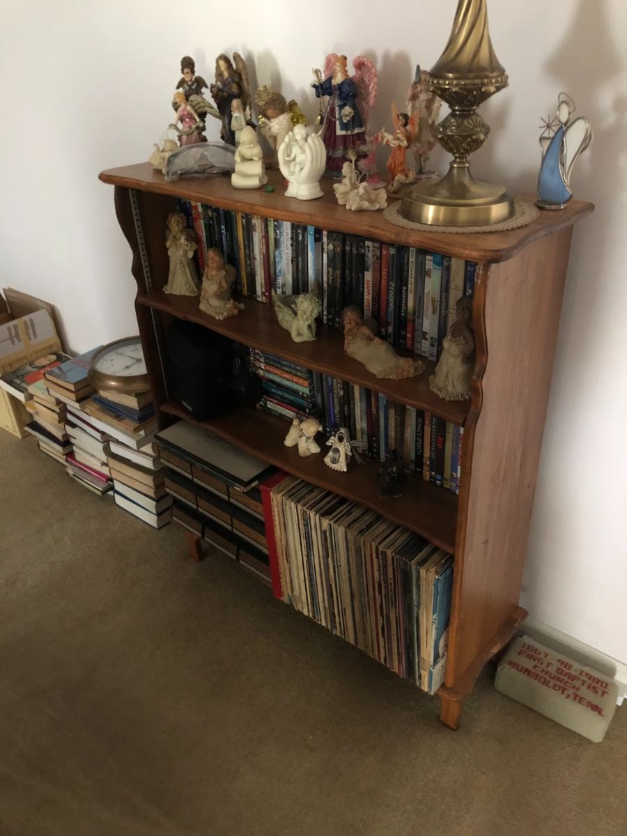 -3 Bedrooms of furniture including a Sleep Number bed - Antique end tables, occasional table, and coffee table -Cherry dining room table with 6 chairs and china cabinet -Cherry office furniture including desks, filing cabinets, and printer stands -Storage cabinets and cube shelves -Rattan and glass coffee table and sofa table -Bookshelves -sewing table and sewing machine -microwave, coffee maker, and other small home appliances -Linens and household items -Dishes, pots, pans, serving ware -Silver coffee set, silver punch bowl with cups, silver candelabras -Home decor and art -Christmas and other holiday decor -Women's clothes including lots and lots of...