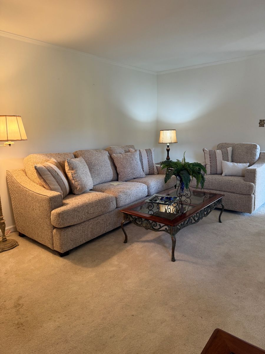 Lazy boy sofa and swivel chair, Lazy boy sleeper sofa, Ashley sectional sofa, karastan rug 9x5.9, tilt top table, end tables and coffee tables. Iris dish, beautiful prism lamp, lamps, Pyrex bowls, small kitchen table and chairs, port meirium bowl, small appliances, mid century cabinet, Waterford vase, marble apples and eggs, linens, Christmas items and much more!