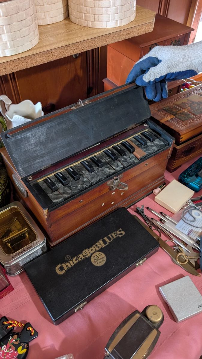 This home is packed with vintage!!!! There are rare 1930's blown glass Santa heads and balls, vintage Christmas, 1980's kitchen table, chairs, Waterfall armoire, 4 drawer chest, bakers rack, vintage dresser/vanity with bench, vintage desk, Futon frame, nightstand, recliner, side chairs, marble top small chest, tea cart, metal kitchen cart, hat collection, quilts, Duke and Oklahoma memorabilia, shelving, adjustable bed, dresser, mid century plastic chairs, albums, character glasses, brass, pots and pans, vintage eye glasses, marbles, small appliances, McKoy planters, vintage china, flatware, knife set, Harmonica set, Peanuts lunch box, jewelry, jewelry boxes, vintage portable teak harmonic, antique rocker, tools,...