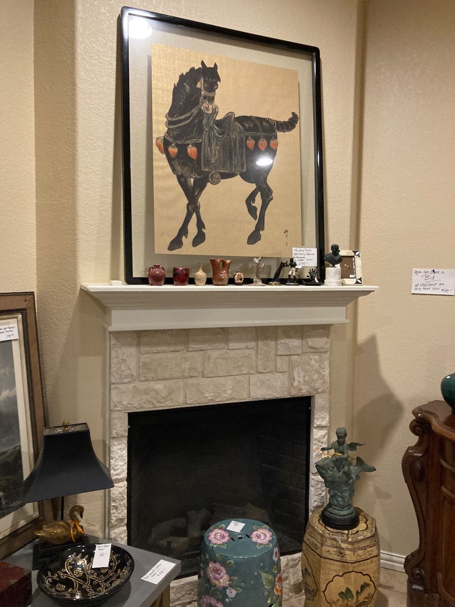 Very unique items at this sale! Pictures coming later! Herschede Nine Tube Grandfather tall case clock Large Buffet/ Bar/ Entrance piece from the Amon Carter estate. Colonial Lighted Hutch Mid Century wood desk trimmed in brass, Mid Century buffet Light wood Queen Anne desk, Queen Anne Chair and end table Gray cutwork coffee table and end table. gray print upholstered chair, rocker Upholstered Couch, decorator pillows, enameled top kitchen table Large framed mirrors Sofa table Night stand/small table, bookshelves Adjustable twin bed, also twin day bed Two desk chairs Electronics, Christmas. Johnson Bros. England Willow Blue dishes, Blue and white...