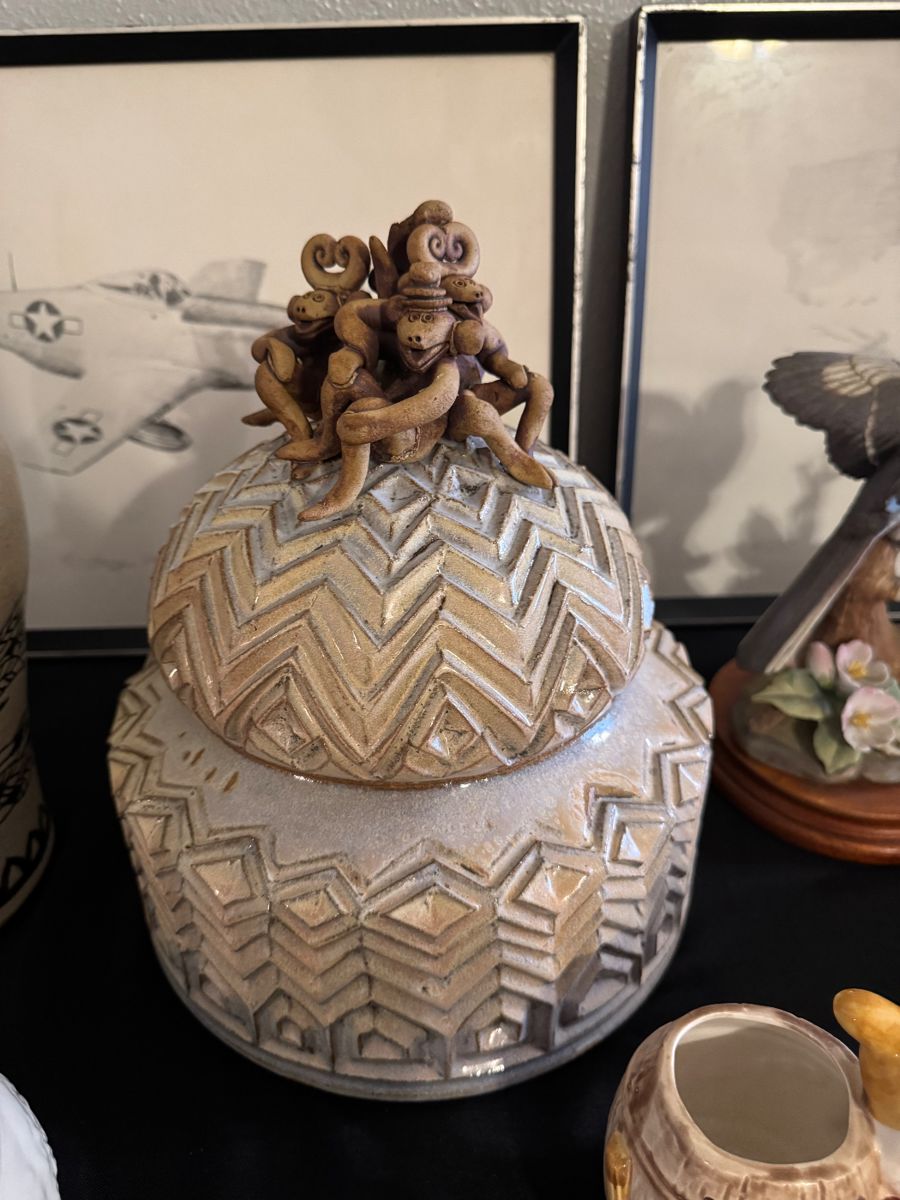 Lots of Different Items Available! We have brought in some very special Wilhelmi pieces, including a lamp base We have Art and Prints! Sweet quilt and shams, King sized bed and furniture. Queen Bed Cute clothes, handbags and shoes Camera Equipmemt Large Vintage Cast Iron Chili Pepper Door Knocker Rollei Cameras Vintage pearl snap Wrangler, Larry Mahan, Ruddock Rare art and bronze statues: Boulton, Thomas Page, Remington, Jack White, Jean Andrews Mid Century Cut to Clear glass Vintage Mid Century Items Knives Fridge, Washer and Dryer Antique Dining Table Griswold 1003 Deep Fryer with Metal Basket Record Albums and 45’s...