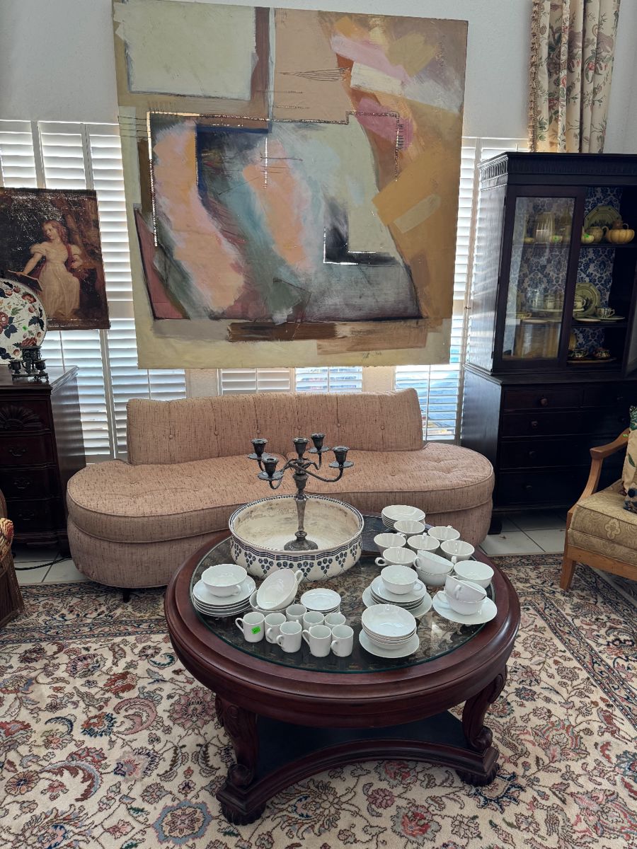 From Primitive to Antique Mid Century to Vintage From Far Away and Close to Home! We have it all! Tapestries Baker Furniture Founders MCM Furniture Wicker, Rattan & Bamboo Crystal, Glassware, Pottery Louie Vuitton Duffel Bags Lamps Handmade Rugs Original Oil Paintings & Water Colors Prints Needlework Foot Bench Christmas Decor Double Sided Partners Desk Beautiful Books in all Genres Singer Featherweight Sewing Machine Antique Dress Form Various Upholstered Chairs Handbags Upholstered Dining Chairs Take a look through the photos, there is a lot here!