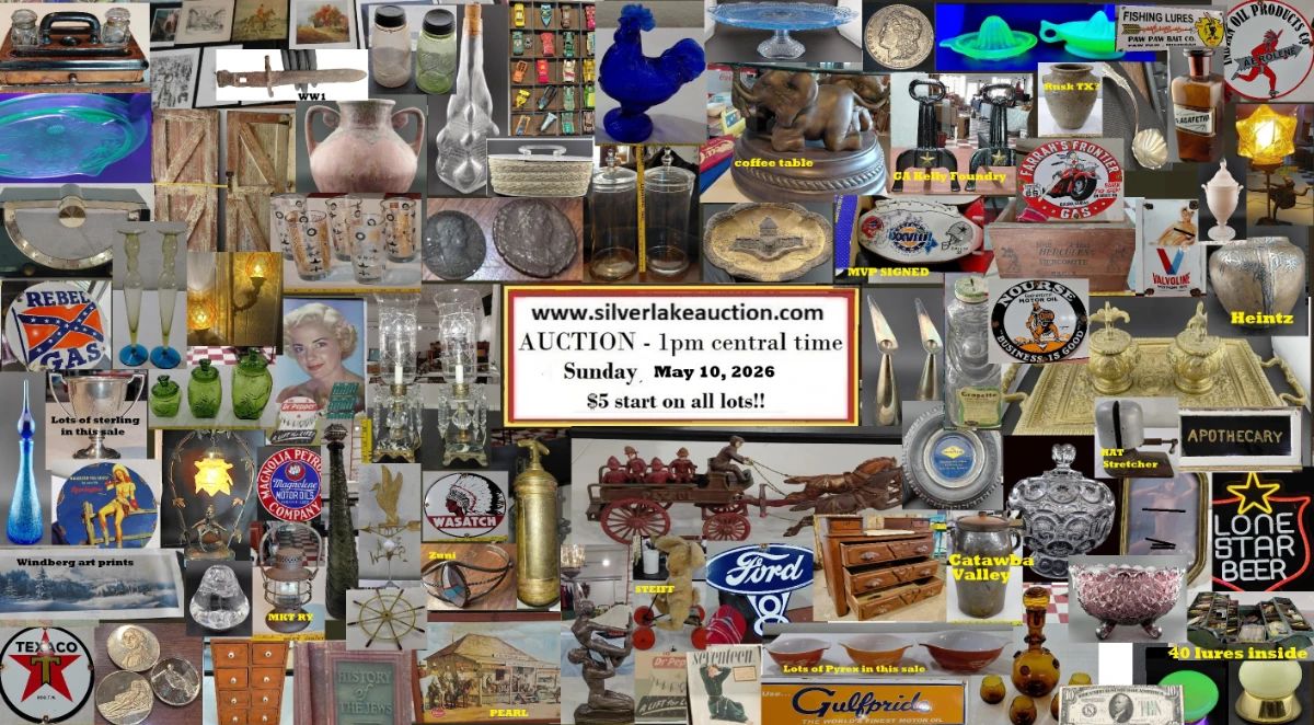 Preview is by appointment the Saturday preceding the auction. Text 903 875 9458 for appointment. This sale contains a wide variety of items including ADVERTISING -We are continuing to liquidate a very large collection of signs, the majority are made of steel with porcelain finish. There are also many other lots with advertising interest. Some of the advertisers are - Ford, Valvoline, Red Crown Gasoline, Farrah's Frontier Gas, Conoco, Union Pacific (Pony Express Map), Wasatch, Coca Cola, Aerolene, Texaco, Enarco, Goodyear (ashtray), Marathon OIl, Apothecar sign (reverse painted on glass), Nourse Oil, Sinclair, Railway Express Agency, Firestone (sales sample), Baker...