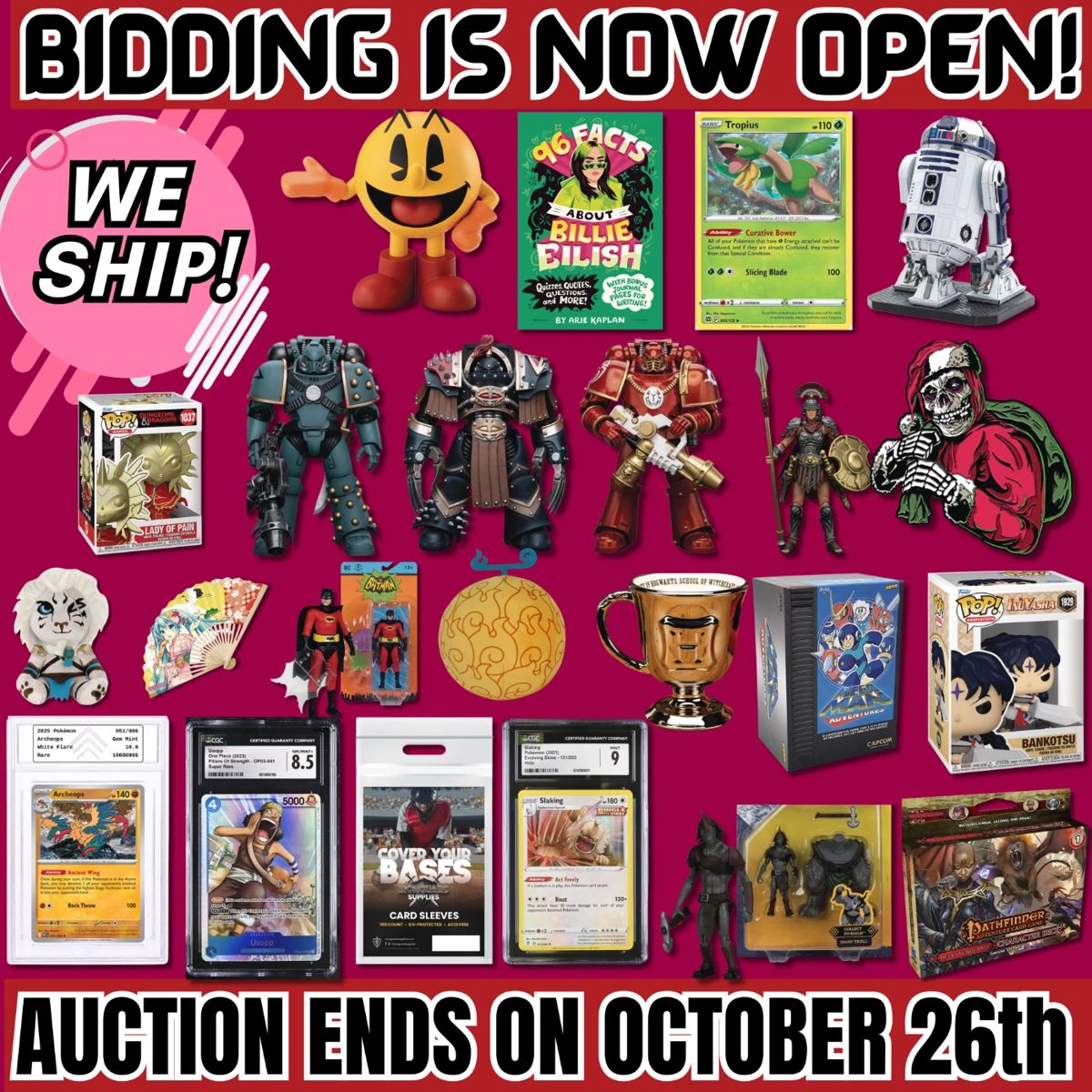 Place your bids at https://garnetgazelle.hibid.com/ bidding is open now, but be quick because the items will start closing at 11 AM Central / 12 PM Eastern on Sunday. Check out our exclusive auction packed with collectible treasures like Sports Cards, Pokémon Cards, Action Figures, Funko Pops, Plushies, Lego Sets, Toys, and more! Each week, we feature a fresh selection of unique and exciting items that are sure to catch your eye. This auction is one you don't want to miss! If you have questions please email us at support@garnetgazelle.com Buy multiple items to maximize savings as we combine items for...