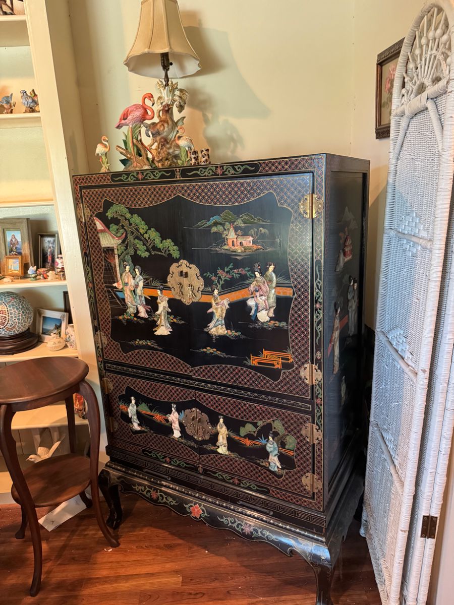 This Estate is full of high grade collectables, vintage and antiques. Please keep coming back to view the items as we organize and prepare for the sale. THERE IS A BEAUTIFUL JAPANESE BLACK LACQUER FOUR DOOR CABINET WITH ABALONE INLAYS THERE IS A VERY NICE WESTERN STYLE COUCH WITH COWHIDE WITH HAIR COVERING THERE IS A NICE GROUP OF ROOM RUGS AND AREA RUGS THERE ARE A NUMBER OF CAMPODIAMONTE FLOWERS PIECES THERE ARE SOME LA LIQUE FIGURES THERE IS A NICE COLLECTION OF CAMERAS, 35 MM AND DIGITAL THERE ARE A NUMBER OF FUR COATS, A VEST STYLE WITH...