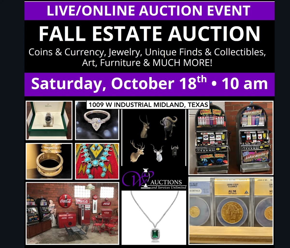 Auctions and Services Unlimited Saturday October 18th 10 am 1009 W Industrial Midland, Texas FALL ESTATES AUCTION: A LIVE/ONLINE AUCTION EVENT Preview 10 am Friday Treasure Alert! We are excited to present this exceptional auction, showcasing an impressive selection that includes rare Coca Cola Collectibles, a wide range of firearms, valuable coins, and spectacular jewelry, along with many other unique treasures. This event offers something for every collector and enthusiast, making it a must-attend occasion. Auction Highlights Firearms, Fine Jewelry including 2ct Diamond Ring, 18ct gold Tourmaline & Diamond Necklace, Rolex, Coins including Gold & Silver, Native American Jewelry, Original...