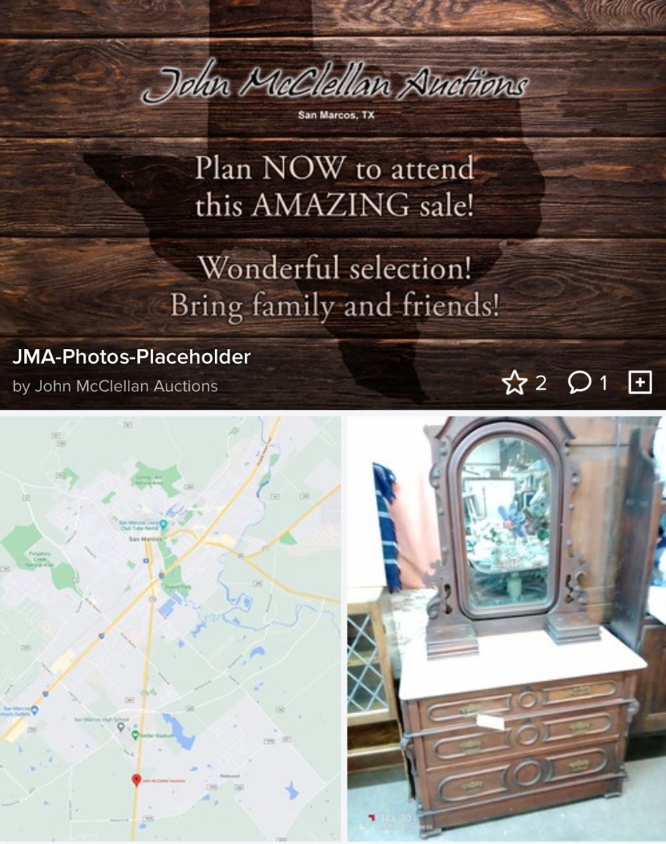 Due to bad weather, we have rescheduled the Friday sale to Sunday 10am! 219 Pics! Tell friends and neighbors! Don't miss this AWESOME selection! Full listing & photos http://sm-auction.net John McClellan's Rescheduled Sunday American Antique AUCTION Due to bad weather, we have rescheduled the Friday night sale to Sunday 10am! Tell friends about this rescheduled Sunday 10am Sale! WONDERFUL SELECTION! Don't miss this one! Viewing - Sun, May 4, from 8am Sale - Sunday, May 4, 2025 @ 10am 4721 North State Highway #123, San Marcos, TX 78666 Call us for questions: Lisa - (512) 393-4633 John - (512) 754-1008...