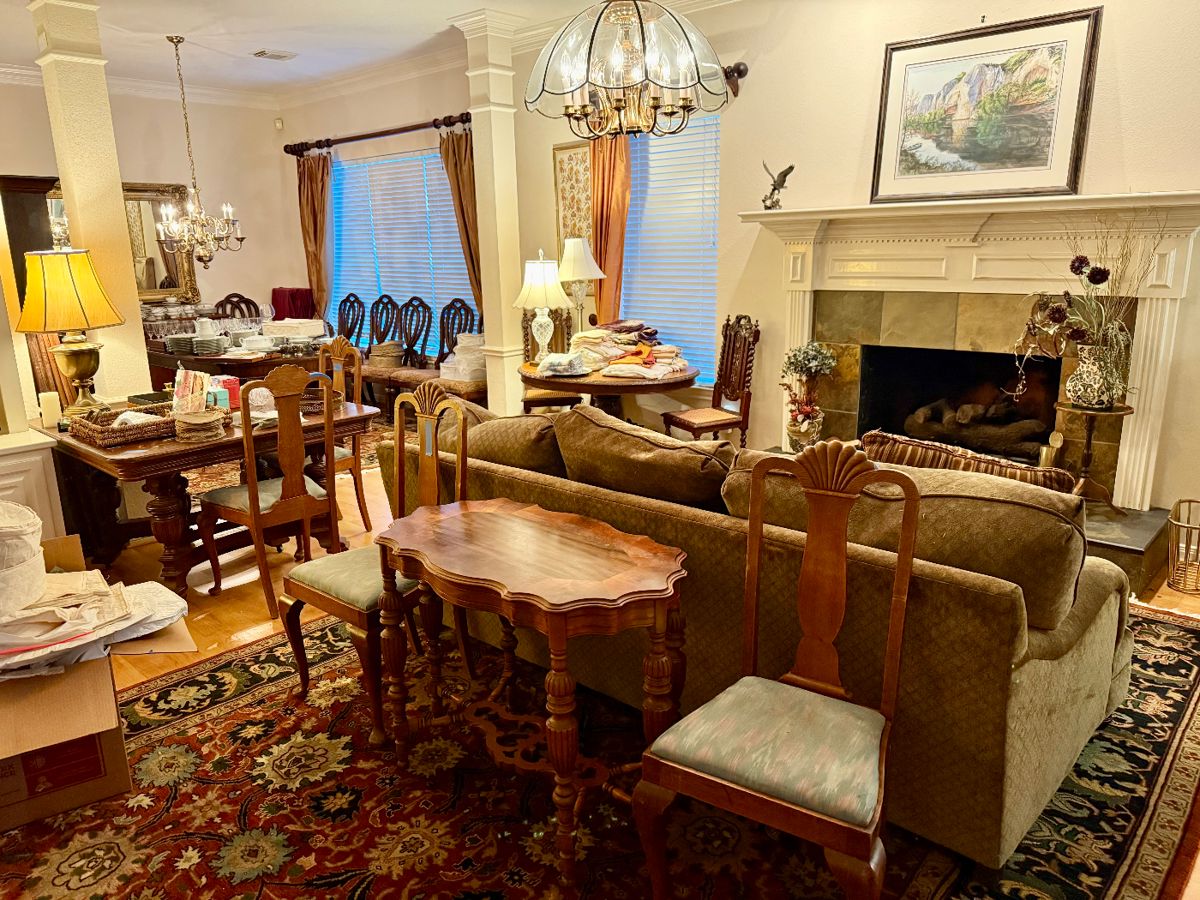 Great antique furniture and newer furniture. Old memorabilia and collectibles. Couch, Chairs, Dining Table with chairs, 2 Antique tables with chairs. (some need repair), coffee tables, side tables, Wall Art (Paintings & prints), lamps, rugs, round glass kitchen table, 4 chairs, bar height chairs, china cabinet, glass, crystal & other collectibles (Waterford, Tiffany, Lenox & more), Newer King size master bedroom set. (Bed, night stands, dresser), Books, records, DVDs, CDs, etc., toys, seasonal items, Piano, Antique Zenith radio (project, not working), Mens and Women’s clothing, purses and shoes, kitchen items and dishes, Beautiful China sets, Refrigerators, bathtub, TVs, Office chairs...