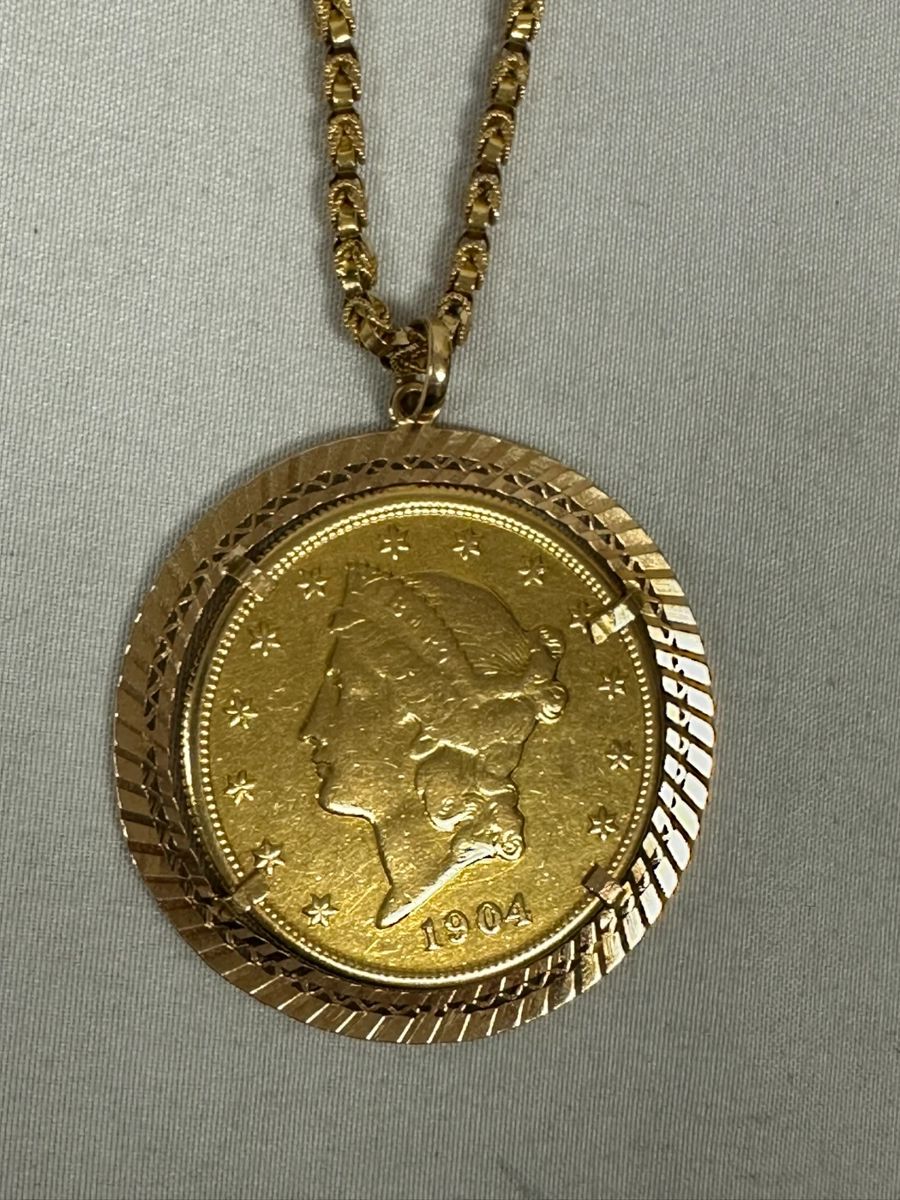 OUTSTANDING GOLD & SILVER COLLECTIBLE COINS! 1904 $20 Dollar Gold Piece Necklace with 18K Bezel & 18K Chain (Over $6,290.00 Gold Value!), 1887-S $10 Gold Piece, 1836 & 1885 $5 Gold Pieces, Graded Coins, Large Lot of Morgan Silver Dollars Including Many CC (Carson City), Peace Silver Dollars, Many 90% Silver Seated, Standing & Walking Liberty Coins. 90% Silver Franklin/Kennedy Half Dollars, 90% silver Barber Coins, Mercury Dimes, Washington Quarters, Roosevelt Dimes, War Nickels, Coin Sets & Much More! MUST SEE AUCTION FOR GOLD / SILVER INVESTMENT & COLLECTIBILITY! IMPORTANT FOR ANY BUYER WHO IS NOT AN ESTABLISHED BIDDER IN...