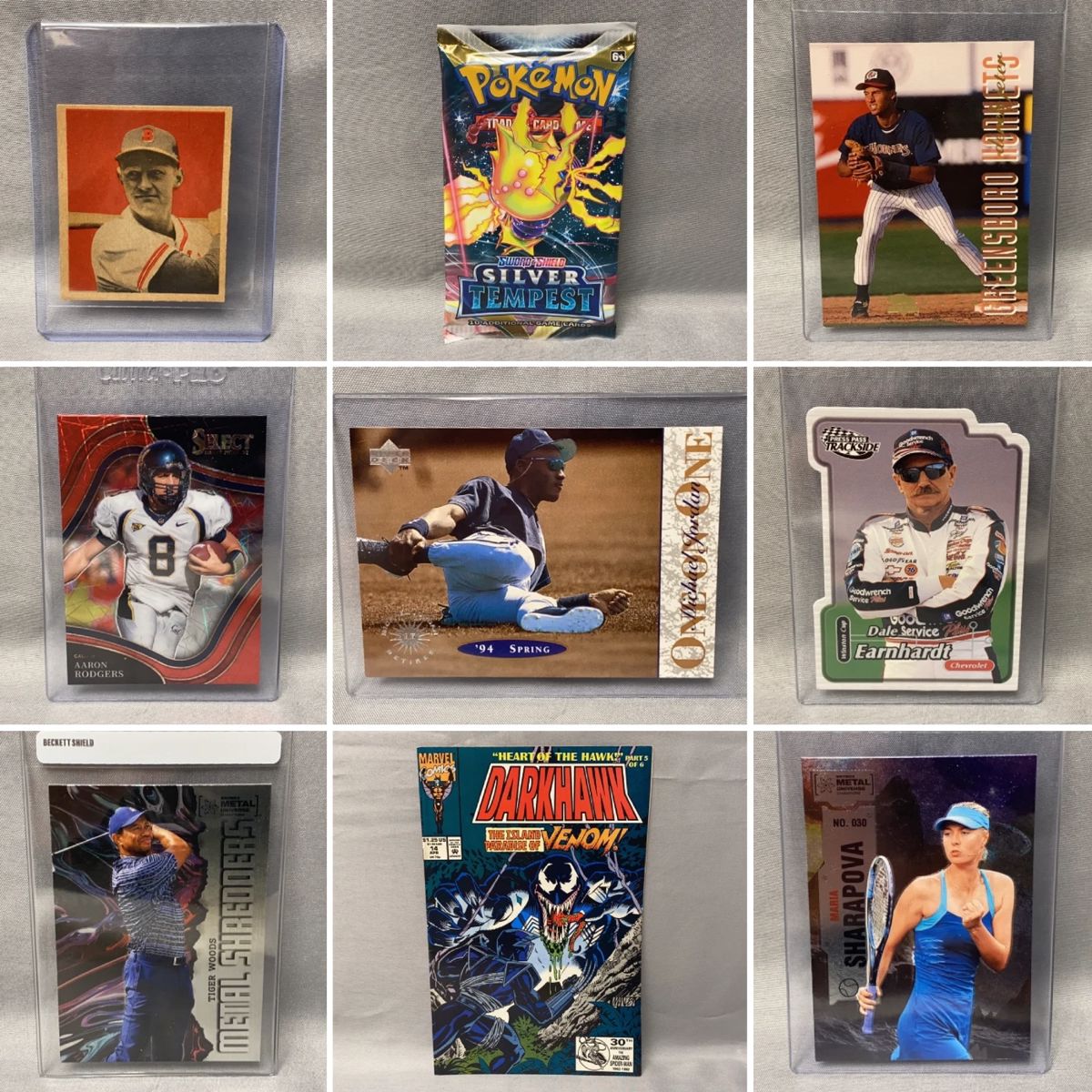 Welcome to our latest Sports Card, Comic Card, Pokémon & Comic Auction! This 375 item auction is filled with NFL, NBA, MLB, NASCAR, autographs, rookies, autographed rookies, limited inserts, specially numbered limited & rare # numbered inserts, relics & patches, prizms & foils, lots of Michael Jordan cards!, a vintage 1949 baseball card, comic cards, Marvel & DC Comics and Cards, Magic the Gathering & a vast variety of Pokémon cards & foils, factory sealed packs & grab bags, which can be found all the way to the very end! Find and WIN the perfect collectible for yourself, as well...