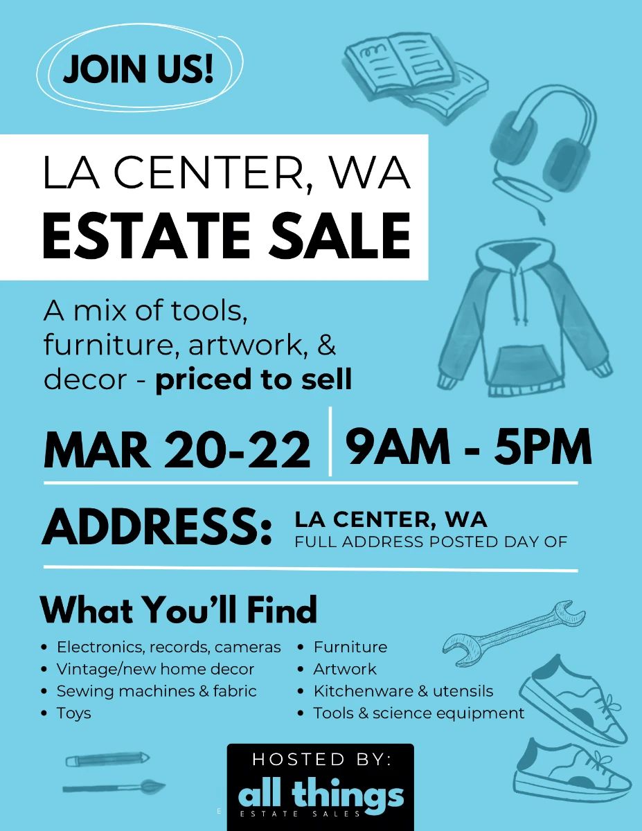 La Center, WA Barn Estate Sale – Furniture, Tools, Vintage Finds & More! Join us for an incredible barn estate sale in La Center, WA packed with a wide variety of treasures! Whether you're a collector, DIY enthusiast, or just love a good find, this sale truly has something for everyone. Sale Dates & Times: 📅 March 20th – March 22nd ⏰ 9:00 AM – 5:00 PM daily 💥 Sunday is 50% OFF everything! Featured Items Include: • Beautiful, high-quality furniture Tons of Records!, • Unique artwork and wall décor • Tools for every project • Sporting goods and outdoor...