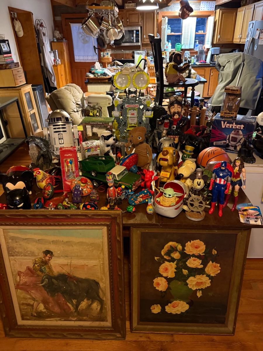 A nice hoard of Fine and Collectible items including Waterford Crystal, Le Creuset, Antique and Vintage Toys, Vintage Alvarez Acoustic Guitar, Luthier Made Banjo, and an Antique Banjo, Gobs of Jewelry, Art, Furniture, Lamps, Dishes, Tools, New in Box Canopies, Art Supplies, Pottery, Stereo Equipment including Bang Olufsen Turntable and Lafayette Amp, Mid-Century Melamine Dishes, Handcarved Asian Trunk, Antique Trunks, Paintings, Carved Jade Items, Iron Toys, New Mini-Fridge, Books, Pendleton Blankets, Paintings, Picasso Prints, Star Wars Toys, Vinyl Records, New in Box Car Parts, Vintage Lionel Train Sets, still unpacking this former reseller storage and home. More photos as I...